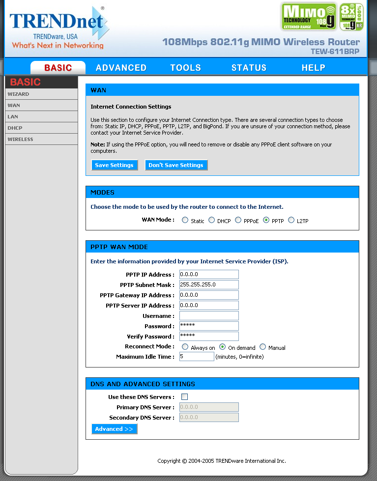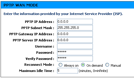 В настройках PPTP указывается IP-адрес и маска подсети WAN-интерфейса маршрутизатора (PPTP IP Address и PPTP Subnet Mask). Если PPTP-сервер находится не в той же подсети, что и WAN-интерфейс роутера, то можно указать шлюз, через который можно получить к нему доступ. Получение этих данных по DHCP невозможно.