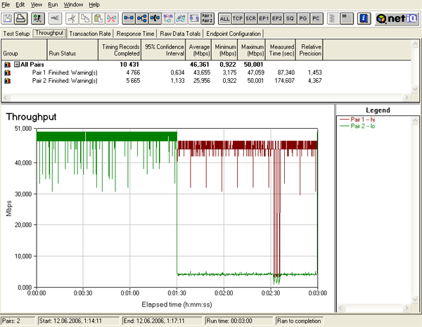 При последовательном запуске потоков трафика с различными приоритетами, распределение скоростей сразу изменяется в соответствии с заданными настройками.