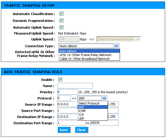Устройство позволяет производить шейпинг только исходящего трафика. Задается как общая ширина обратного канала и использование шейпинга по приоритетам.