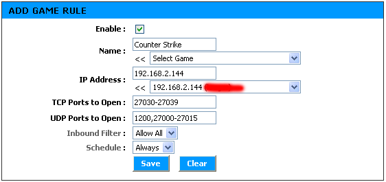 Пункт "Gaming", по сути, является аналогией виртуальных серверов — то есть мы открываем для пользователей из внешней сети доступ к серверам внутренней сети по определенным портам. Разница заключается в том, что используя "Gaming" мы можем одним правилом задать диапазоны используемых ТСP и UDP-портов, а также IP-адрес сервера во внутренней сети.