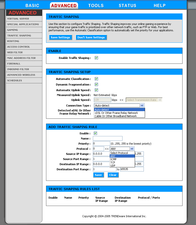 Шейпинг трафика по приоритетам не будет корректно работать, если не будет задана ширина обратного канала. Добиться работы автоматического определения скорости обратного канала (Automatic Uplink Speed) не удалось.