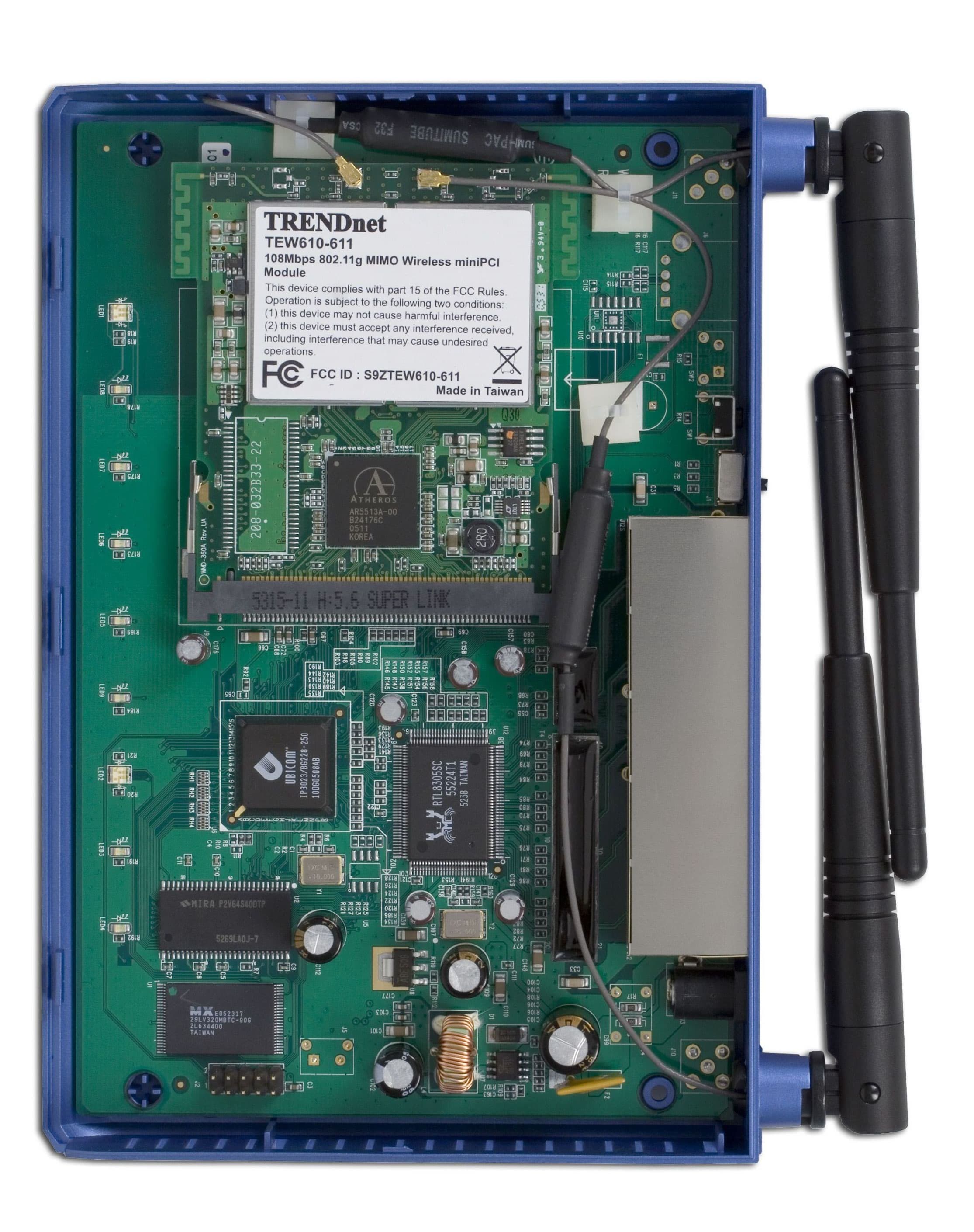 Беспроводная часть устройства выполнена в виде отдельной mini-PCI-платы. Контроллером беспроводной связи является Atheros AR5513 (MIPS 180 МГц, аппаратная поддержка AES и TKIP, WMM, USB 2.0). Остальная электроника скрыта под экраном, припаянным к mini-PCI плате.
