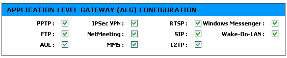 Данный маршрутизатор содержит в себе впечатляющий набор ALG-шлюзов (Application Layer Gateway), которые позволяют работать через NAT с приложениями, которые сами по себе не способны преодолевать NAT.
