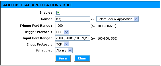 Использование правил для специальных приложений позволяет открыть один или несколько портов, когда производится соединение из внутренней сети во внешнюю. Используя данные правила можно настроить роутер так, что будут открываться порты, указанные в "Input Port Range", когда из внутренней сети будут посылаться данные во внешнюю, на порты, указанные в "Trigger Port Range".