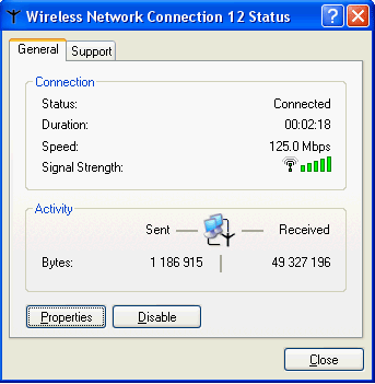 Скорость передачи данных очень неплохая. Опечаливает лишь то, что в автоматическом режиме скорость принудительно сбрасывается на 48 Мбит и, таким образом, режимы 100 и 125 Мбит остаются за бортом. С другой стороны результат в 27 Мбит явно выше, чем может быть даже в 54 Мбит-ном режиме передачи.