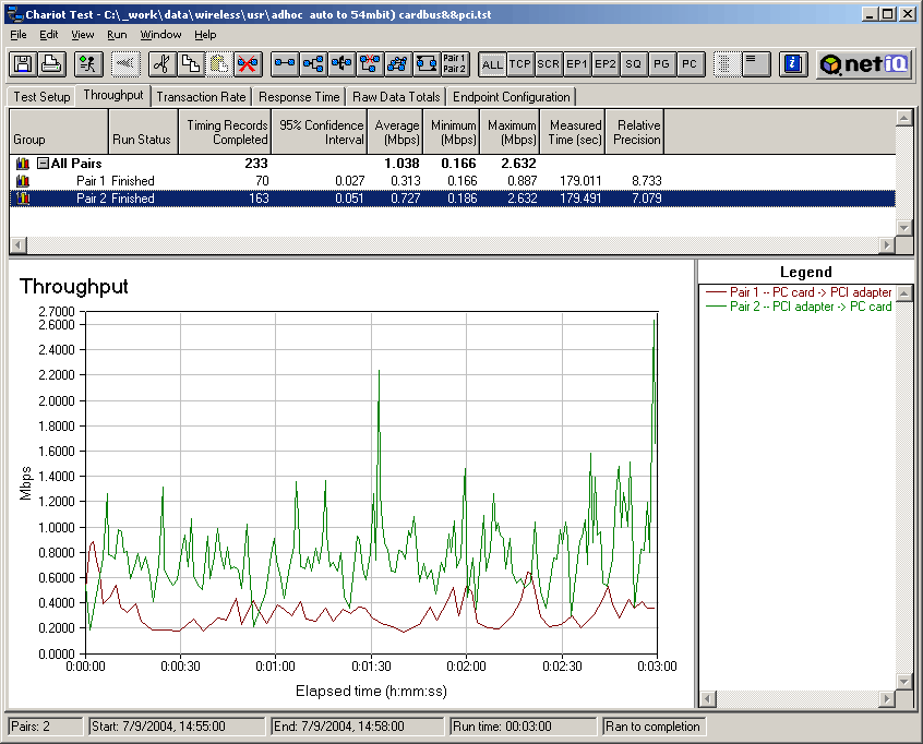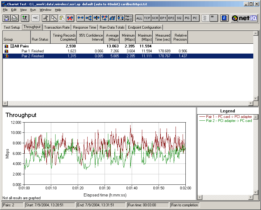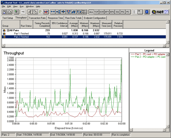 NetIQ Chariot: скорости передачи данных между AP и PCI adapter в режиме 802.11g, 54Mbit rate, Throughput.scr