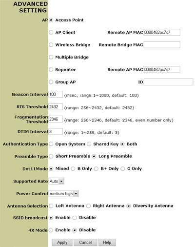 Настройки 802.11g Wireless Turbo PCI Adapter