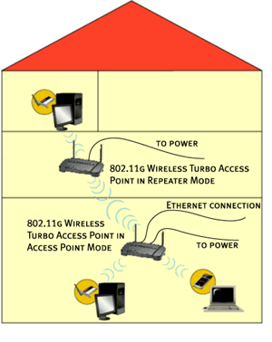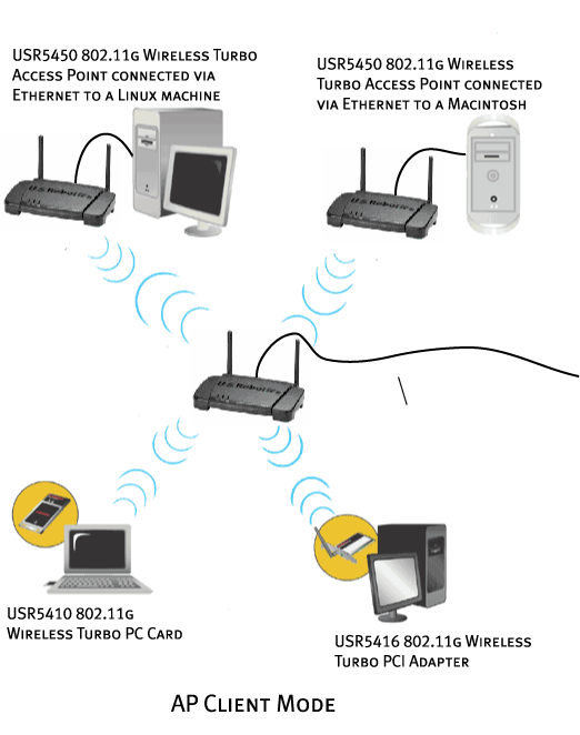 1. Обычная точка доступа, все беспроводные клиенты подсоединяются к устройству в режиме infrastructure. 2. Точка доступа выступает в роли беспроводного клиента (т.е. обычного беспроводного адаптера). 3. Режим моста. Две сети прозрачно объединяются друг с другом через беспроводную связь. Получается одна большая сеть. Точки доступа прозрачны для всех компьютеров из обеих сетей). 4. Режим множественного моста. Предыдущий случай, только сетей (и, соответственно, точек доступа) не две, а три и более. 5. Режим ретранслятора. Точка доступа просто ретранслирует (передает далее) сигнал от/к другой беспроводной сети, тем самым увеличивая радиус покрытия последней.Схемотехника 802.11g Wireless Turbo Multi-Function Access Point (USR5450)