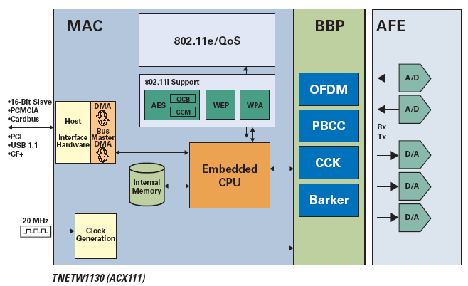 И все же, судя по маркировке, у контроллера TNETW1130 должно быть много общего с TNETW1130GVF. В TNETW1130 интегрирован ARM процессор, чип поддерживает WPA (SSN), TKIP и AES (CCM) шифрование (802.11i), а так же QoS (802.11e).