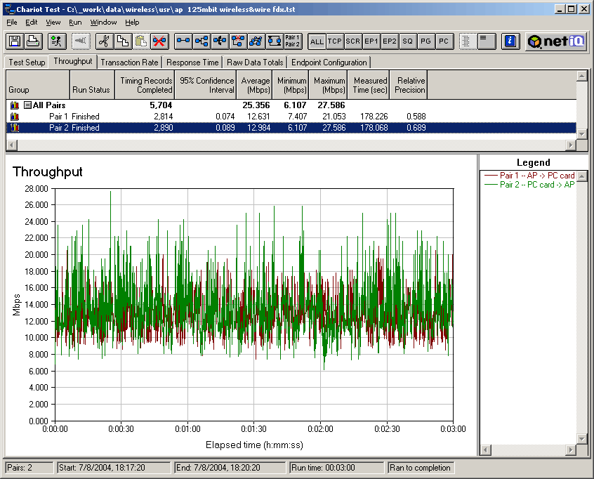 NetIQ Chariot: скорости передачи данных (состоящих из одних нулей) между AP и PC card в режиме 802.11g, 125Mbit rate, Throughput.scr