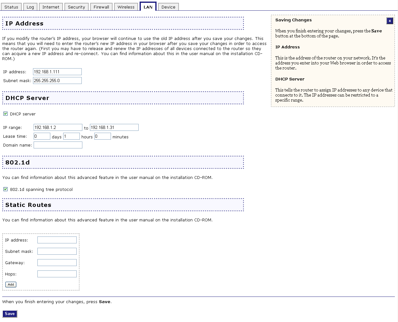 Здесь задаются IP-адрес LAN-сегмента и параметры DHCP-сервера