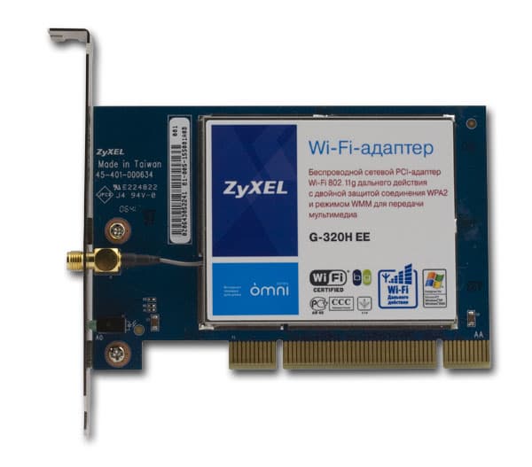 От беспроводного PCI-адаптера ZyXEL G-320H по понятным причинам не требуется наличие стильного дизайна. Стоит он своих денег или нет, сказать затрудняюсь, так как на момент написания обзора он не только не был представлен в каталоге price.ru, но даже не был анонсирован на сайте компании ZyXEL. Функциональные возможности данного беспроводного адаптера полностью повторяют возможности USB-адаптера. Использование передатчика повышенной мощности и усиленной антенны позволяет получить большую скорость и надежную связь на больших расстояниях в сложных условиях.