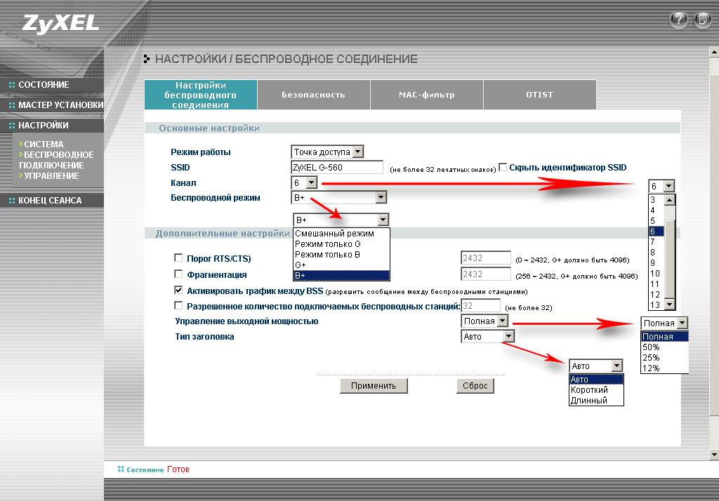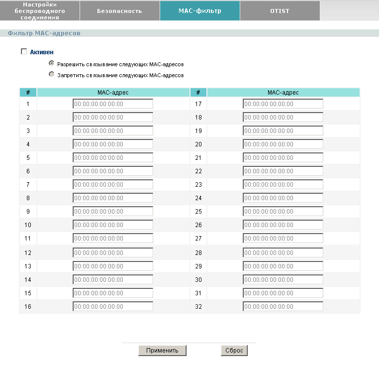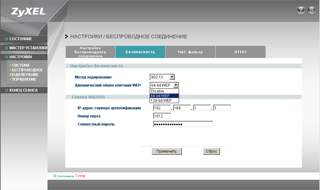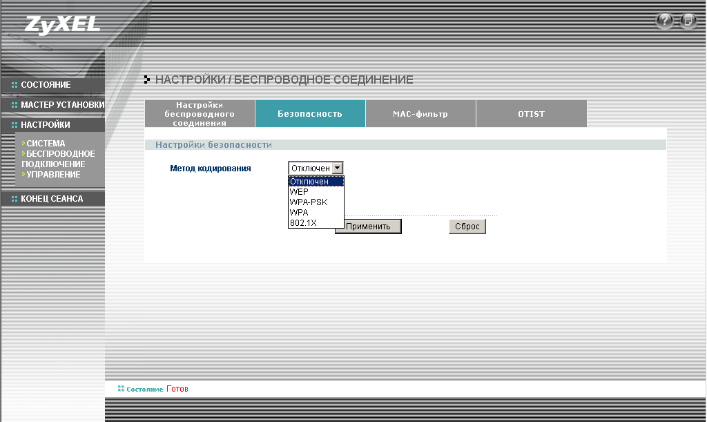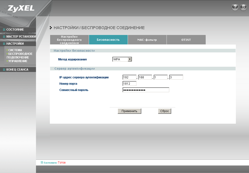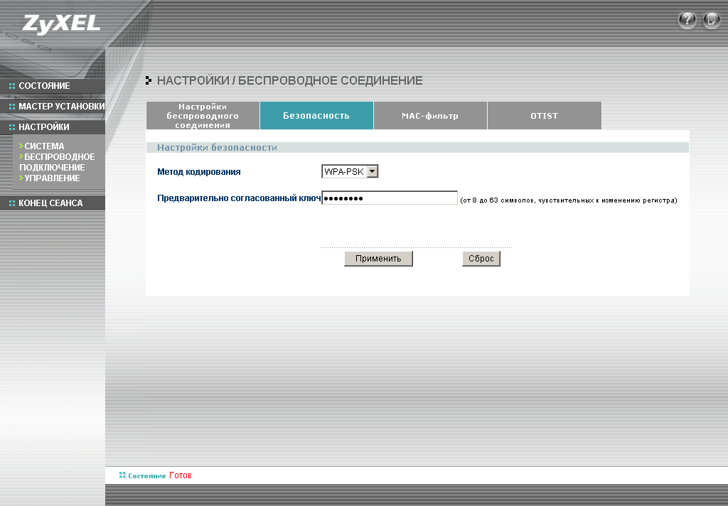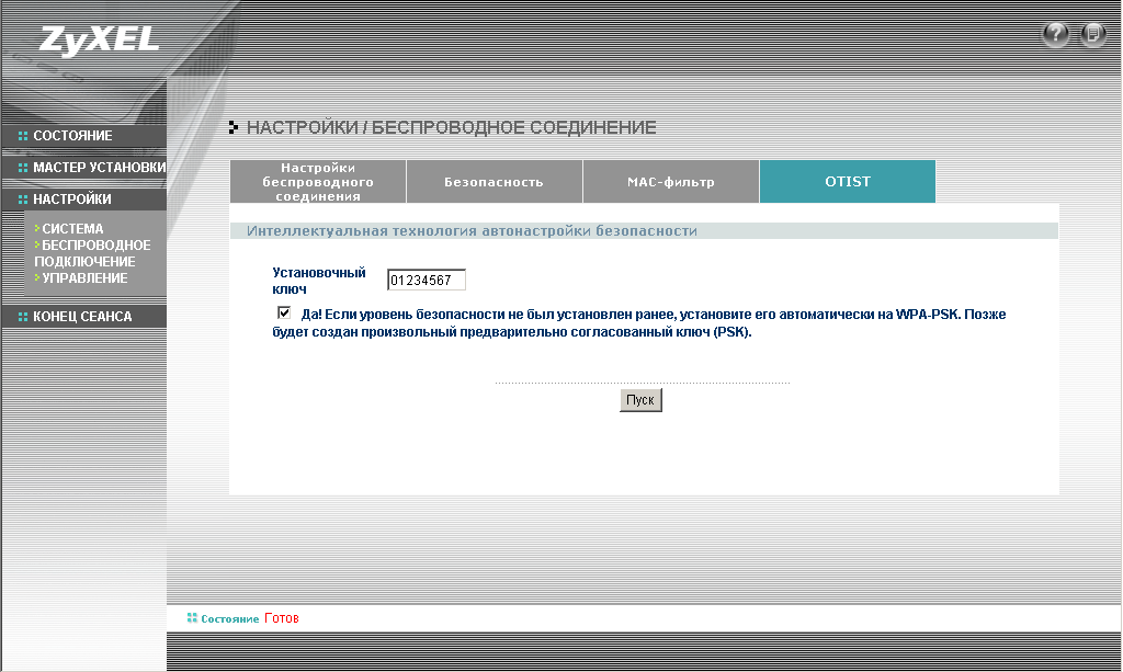 Из особенностей конфигурации хочу отметить наличие режима интеллектуальной безопасности OTIST (One-Touch Intelligent Security Technology). Конфигурация этого режима аналогична конфигурации WPA-PSK — то есть необходимо всего лишь ввести предварительный ключ. Все остальные настройки безопасности (шифрование, ключи) будут выставлены автоматически. Для работы этого режима необходимо, чтобы все узлы поддерживали этот режим. Этот режим самостоятельно устанавливает широковещательный идентификатор беспроводной сети (SSID) и параметры безопасности (WEP или WPA-PSK).