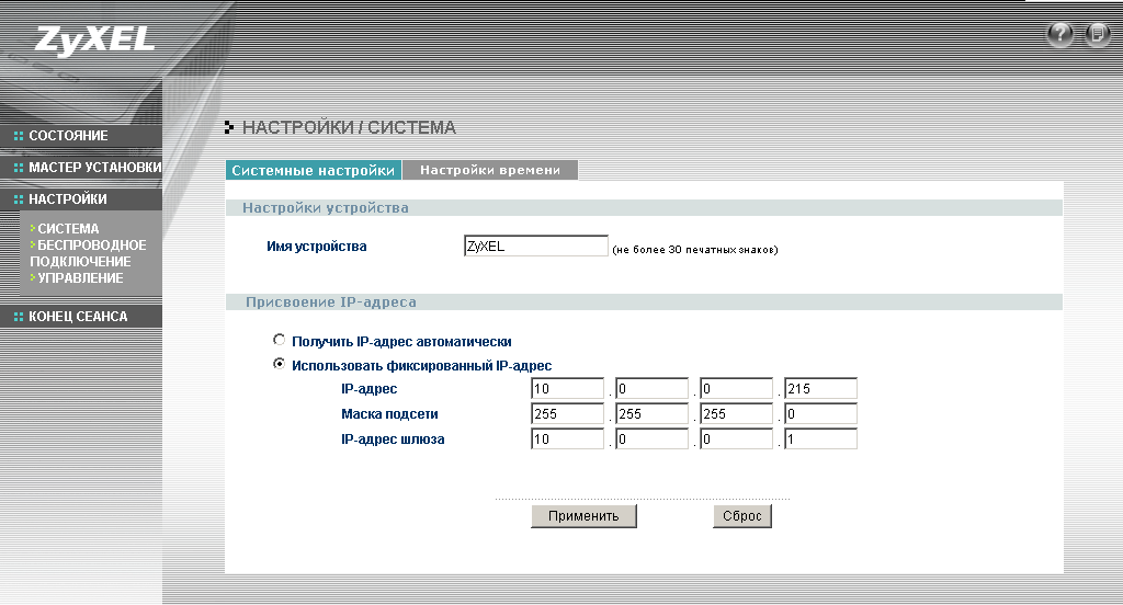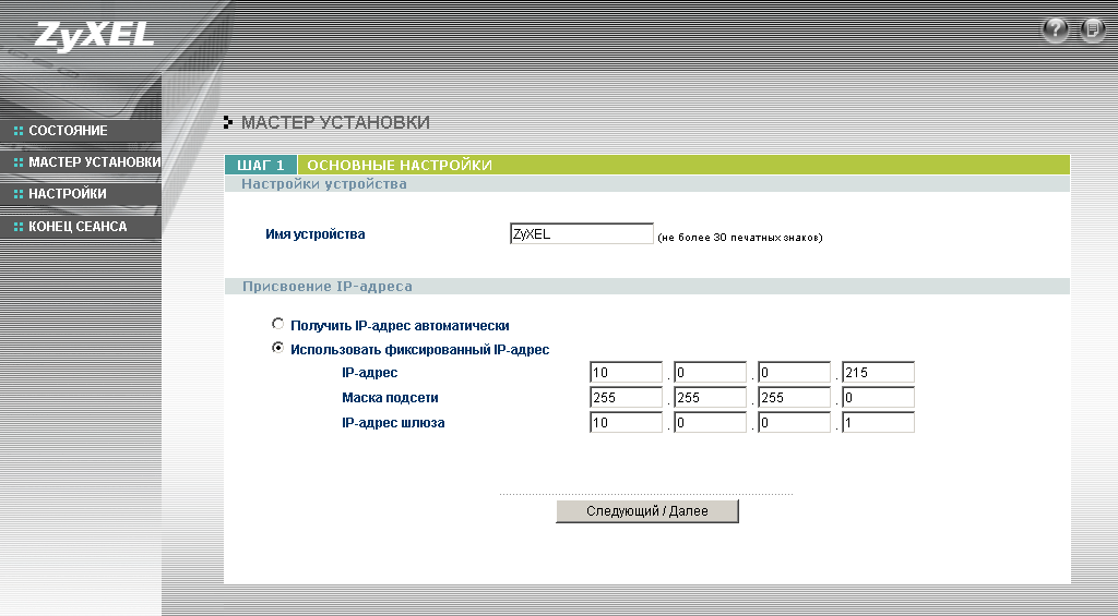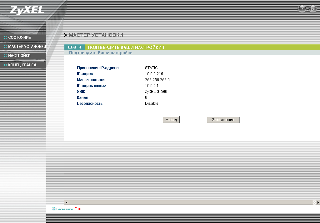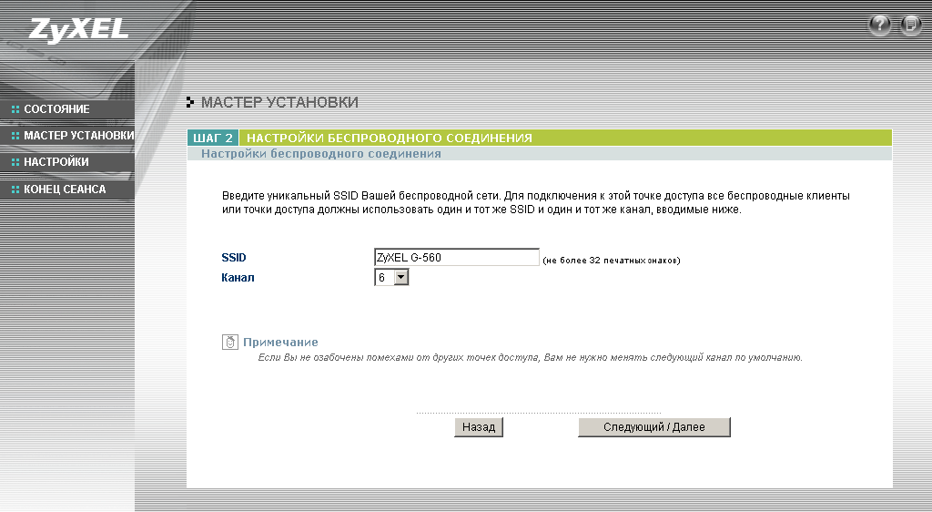 Конфигурация устройства осуществляется через WEB-интерфейс или по протоколу Telnet. Через WEB-интерфейс точку доступа можно быстро настроить, используя "мастер установки". Скриншоты настроек приведены ниже: