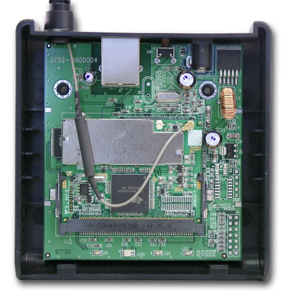Беспроводная часть точки доступа выполнена в виде отдельной mini-PCI платы, расположенной на основной плате устройства на базе контроллера Texas Instruments TNETW1130. Экран на этой плате, скрывающий под собой трансивер, закреплен металлическими крепежами (на картинке: на левой и на правой стороне экрана) — поэтому снять его не удалось.
