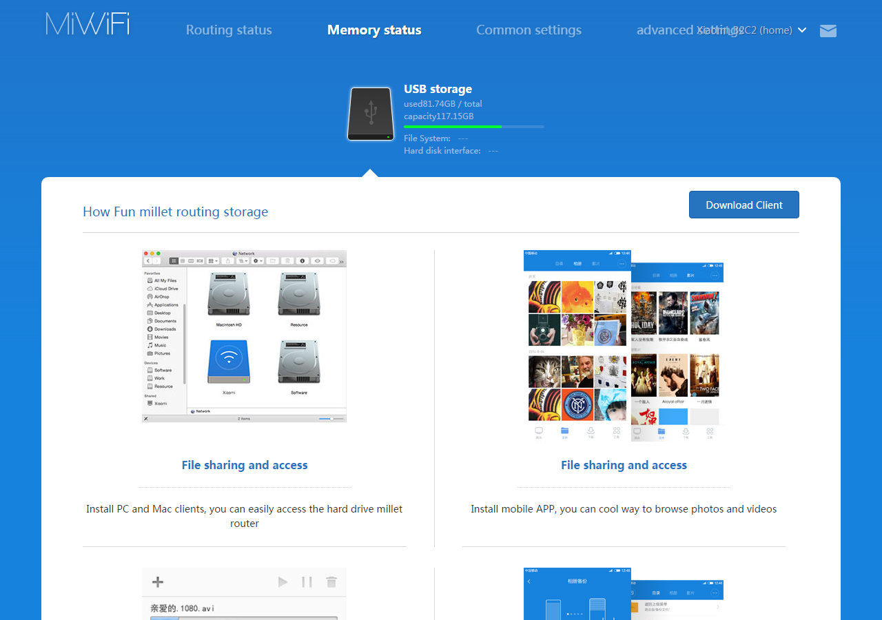 На второй мы видим информацию о подключенном внешнем накопителе и описания вариантов доступа к файлам на нем. Обратите внимание, что из браузера к нему обратиться нельзя. Нет в веб-интерфейсе и возможности изменения параметров сервисов для накопителя.