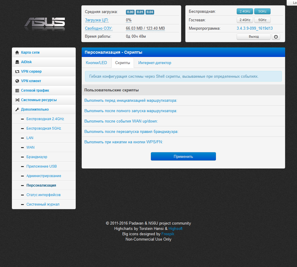 Учитывая гибкость, универсальность и открытость этого проекта, детально описывать его возможности в этом материале нет смысла. Отметим только ключевые особенности в применении к рассматриваемому роутеру и отечественному пользователю: русский и английский интерфейсы, работа с PPTP/L2TP, поддержка технологий IPTV, расширенные возможности по работе с USB-устройствами (включая сервер FTP, протокол NFS, клиент загрузки файлов transmission и работу с сотовыми модемами), реализация сервера и клиента VPN (PPTP, L2TP, OpenVPN), средства мониторинга загрузки сети, процессора и оперативной памяти, организация гостевых сетей Wi-Fi, расписание работы Wi-Fi, доступ к консоли по telnet и SSH, пользовательские скрипты для ключевых событий, поддержка систем управления пакетами. В работе на рассматриваемом роутере прошивка показала себя с хорошей стороны, никаких проблем с ней не было.