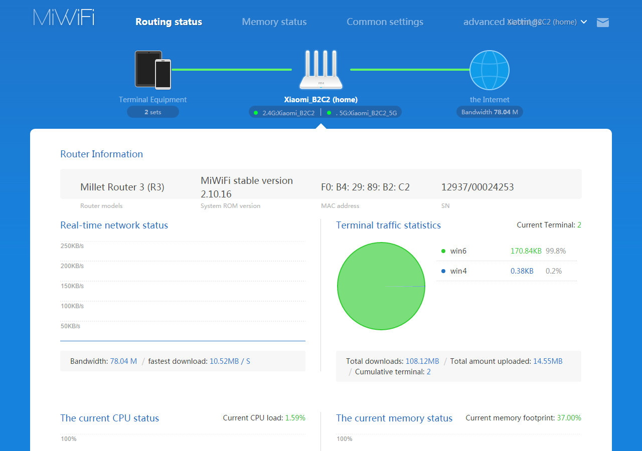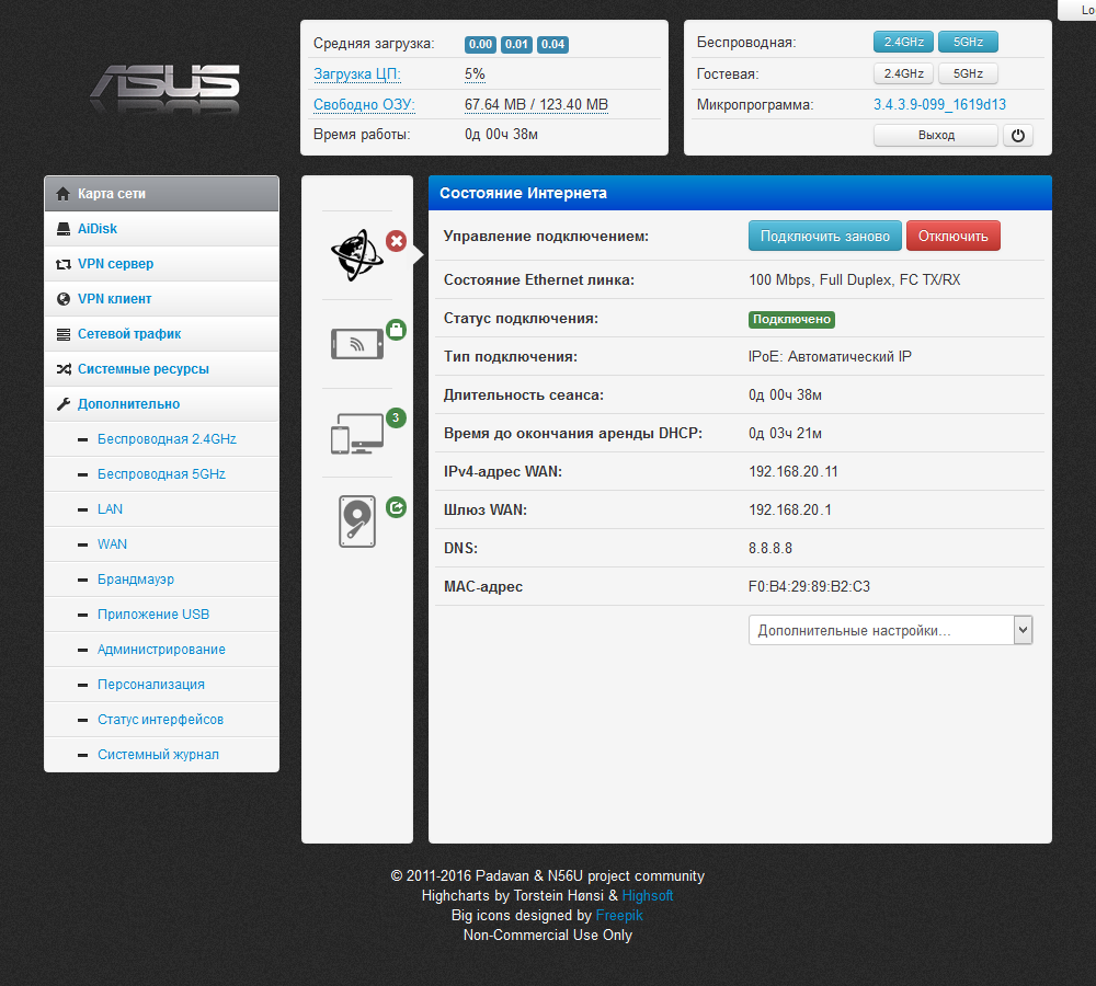 В верхней строке присутствует четыре пункта — статус, внешний накопитель, основные настройки, дополнительные настройки. На первой странице отображается текущее состояние устройства, включая занятость интернет-канала, процессора и памяти, список подключенных клиентов и статистика по ним.