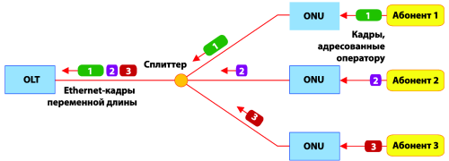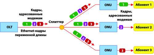 Сеть PON состоит из нескольких элементов — коммутатора на узле связи, линий связи с пассивными сплиттерами в узлах сети и модемов на стороне абонентов. К каждому модему поступают все пакеты от коммутатора, а во время передачи используется временное мультиплексирование кадров.