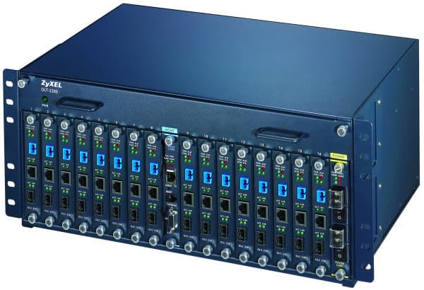 Линейка продуктов GEPON у ZyXEL состоит из трех коммутаторов и трех модемов. Младшая модель коммутатора — OLT-1308H — имеет восемь портов GEPON и восемь соответствующих им Gigabit Ethernet (обратите внимание, что именно гигабитных, устройства с меньшей скоростью к ним подключить нельзя). К каждому оптическому порту можно подключить до 32-х модемов в итоге получив 256 абонентов на устройство. Все коннекторы расположены на лицевой стороне устройства — 8xPON, 8xGigabit, консольный, 10/100BaseT внесетевого управления и питание. Здесь же есть и кнопка сброса устройства. Все порты имеют набор индикаторов для определения текущего статуса. У OLT-1308 есть встроенный гигабитный L2+ коммутатор (неблокируемая коммутация с пропускной способностью 24 Гбит/с, скорость коммутации кадров 17,8 млн. пак/с) и четыре совмещенных порта 1000Base-T/SFP. Такой вариант можно использовать для резервирования канала — при одновременном подключении двух разъемов (SC и RJ45) работает оптика, а в случае аварии в оптическом канале происходит автоматическое переключение на медь. Питание и консольный порт у этой модификации находятся на задней панели. Данные модели выполнены в стандартном 1U корпусе и рекомендуются для использования в быстрорастущих сетях. Самой производительной моделью является модульный OLT-2300. В его 4,5U корпусе предусмотрено место для установки до шестнадцати OLC-2301. Каждый такой линейный модуль имеет порт GEPON и совмещенный порт 1000Base-T/SFP. В шасси также устанавливается управляющий модуль и блок питания с двойным резервированием. Линейный модули допускают горячую замену, что положительно сказывается на удобстве обслуживания сети и надежности предоставления услуг. Максимально OLT-2300 может поддерживать 512 абонентов. Все оптические модули коммутаторов рассчитаны на дальность работы 20 км.