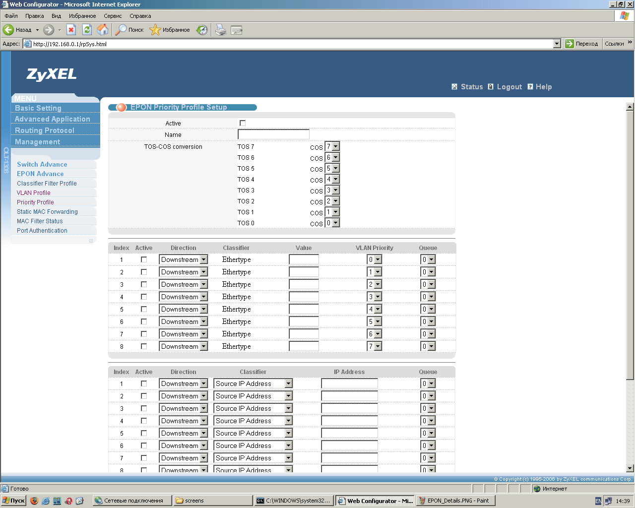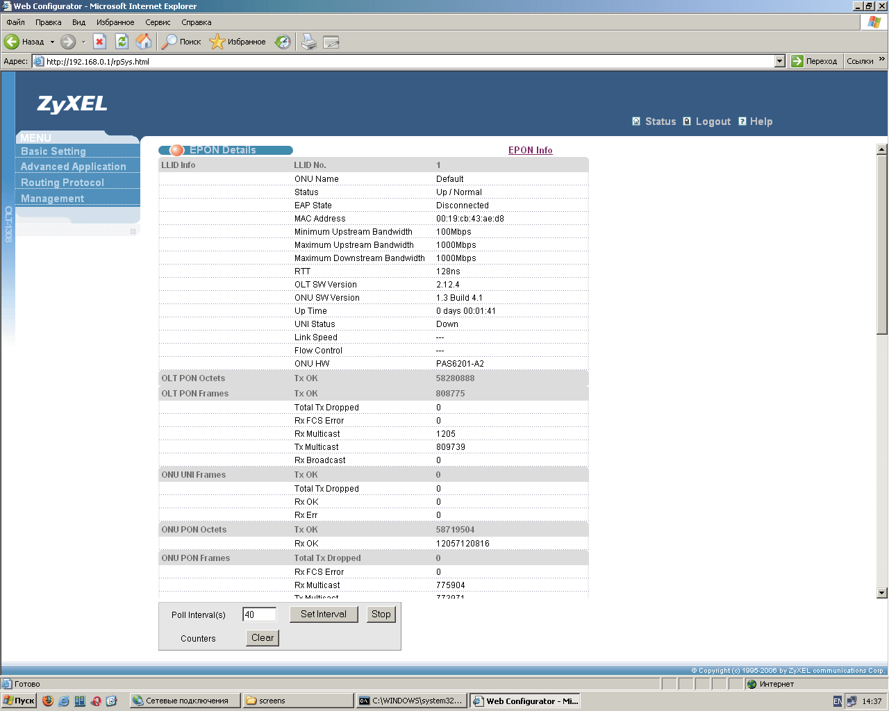 Все GEPON-коммутаторы поддерживают протоколы STP/RSTP и механизмы приоритезации трафика и организации виртуальных сетей (включая Port Based и 802.1Q). Эффективность многоадресных рассылок обеспечивается поддержкой IGMP v.2, IGMP proxy, IGMP snooping и MVR. Для управления предусмотрены порты RS-232 и 10/100Base-TX. Настраивать коммутаторы можно через Web-интерфейс (поддерживается SSL, предусмотрена установка до пяти аккаунтов, примеры скриншотов — 1, 2, 3), telnet, SSH, FTP или консольный порт. Номера портов всех сервисов можно изменить. Возможно ограничение доступа по IP-адресам. Web-интерфейс имеет встроенную систему помощи.