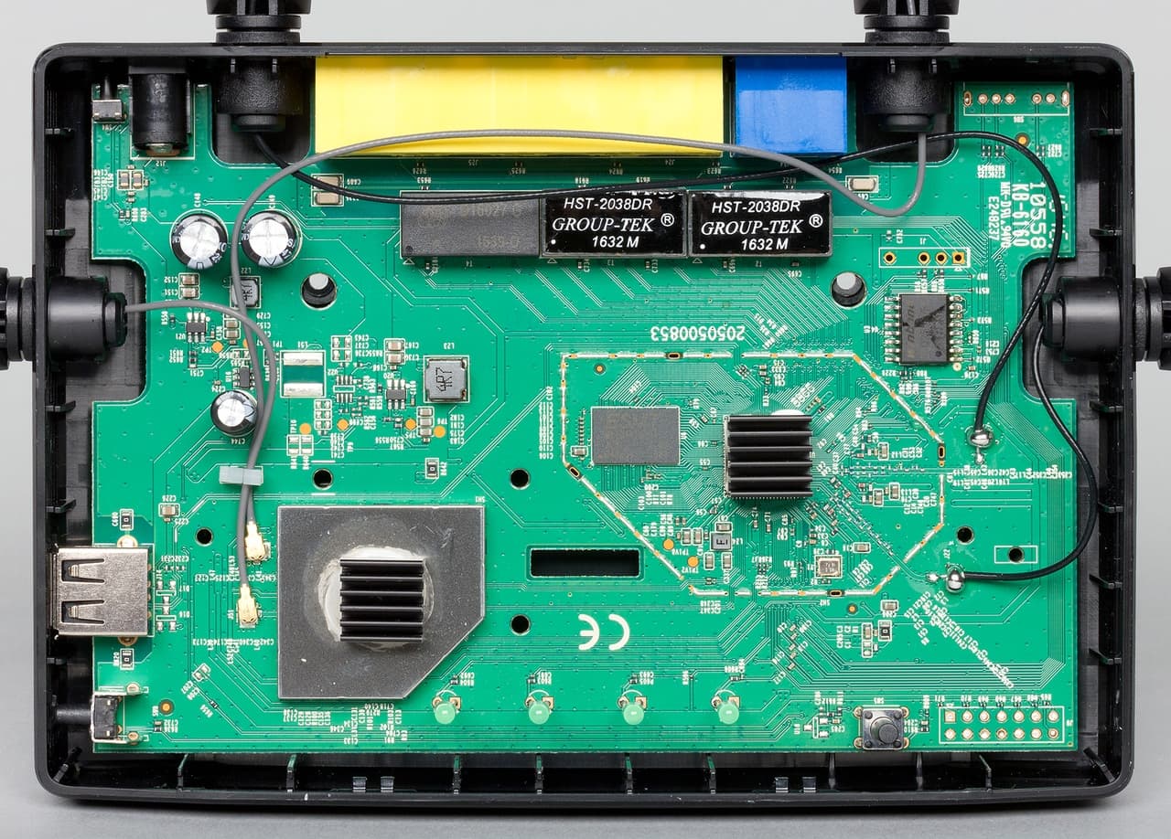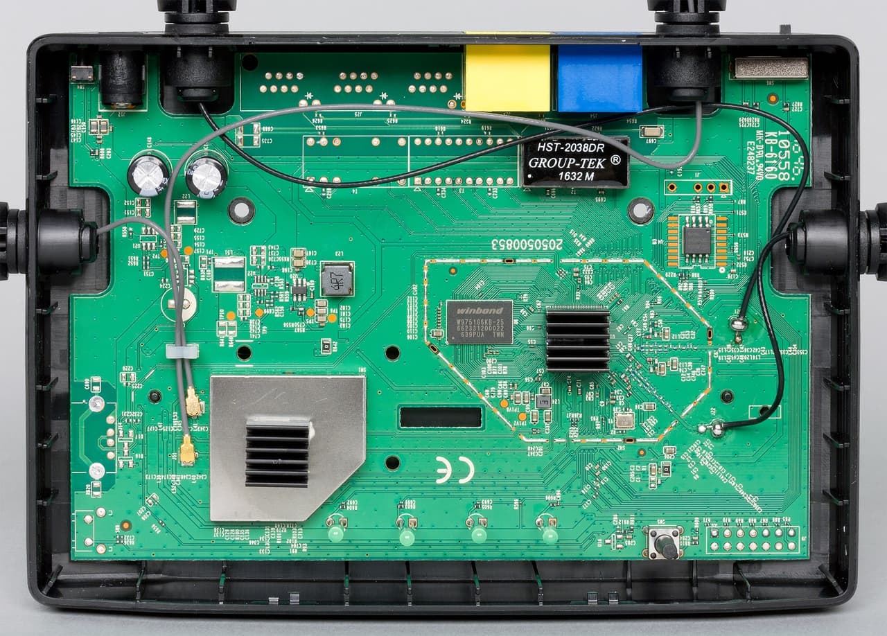 На основном процессоре установлен небольшой радиатор. Такой же радиатор, но уже поверх металлического экрана есть и на чипе радио для диапазона 5 ГГц. Во время работы под высокой нагрузкой корпуса́ роутеров нагреваются, но никаких негативных последствий это не вызывает. Кабели от антенн для 5 ГГц подключаются через разъемы, а для 2,4 ГГц припаяны. На плате присутствует место для установки консольного порта.