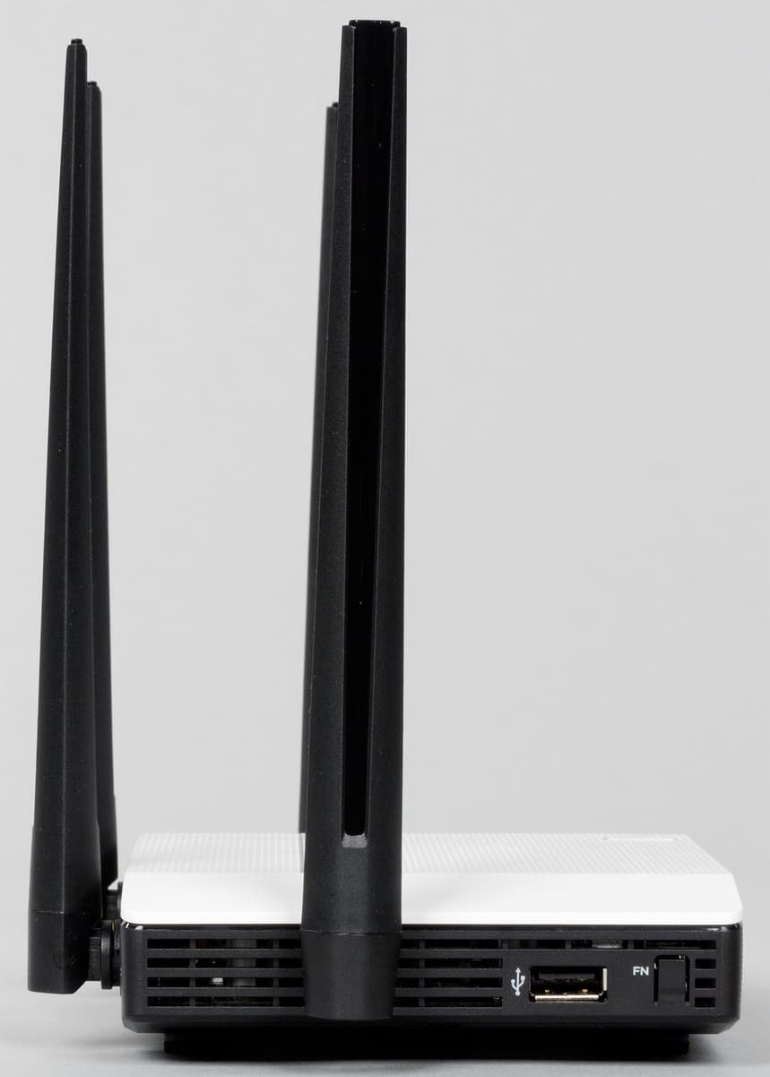 На правой боковой стороне есть только решетка вентиляции и одна антенна. На левой у Keenetic Air все точно так же, а у Keenetic Extra II установлен один порт USB 2.0 и вторая кнопка (действие для нее также можно настроить в прошивке, например на безопасное отключение накопителя).