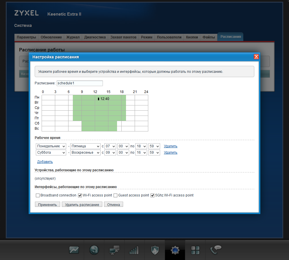 Например, в новой версии есть поддержка расписаний, которую ожидали многие пользователи. Для каждого расписания можно указать любое число интервалов с точностью до минуты и с учетом дней недели. Управление расписаниями предусмотрено для канала в интернет, беспроводных точек доступа (включая гостевую), в правилах межсетевого экрана и правилах трансляции портов, доступе клиентов в интернет.