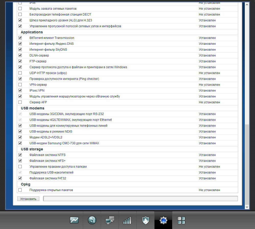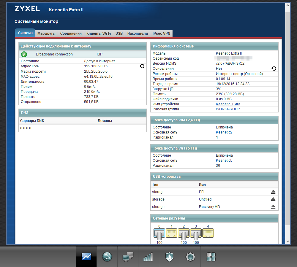 Для Keenetic Extra II в полном объеме представлены связанные с портом USB сервисы: поддержка накопителей с доступом по SMB, FTP и AFP, а также контролем прав доступа, работа с USB-принтерами, подключение к интернету через сотовые модемы 3G/4G и модуль Keenetic Plus DSL, встроенная система автономной загрузки файлов на базе программы Transmission, поддержка программы Time Machine в OS X, медиасервер DLNA, поддержка системы управления открытыми пакетами Opkg, телефонная станция на базе модуля Keenetic Plus DECT. Отметим, что при необходимости работы сразу с несколькими внешними устройствами можно использовать USB-хаб.
