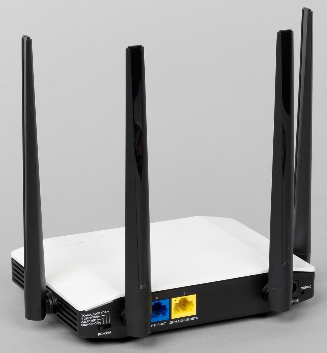 Keenetic Air сзади имеет аппаратный переключатель режима, две антенны, по одному порту WAN и LAN с индикаторами активности (мигают при передаче данных), вход блока питания и скрытую кнопку сброса. У Keenetic Extra II кроме антенн, входа питания и кнопки сброса есть один порт WAN и четыре LAN, а вот переключатель режимов отсутствует.