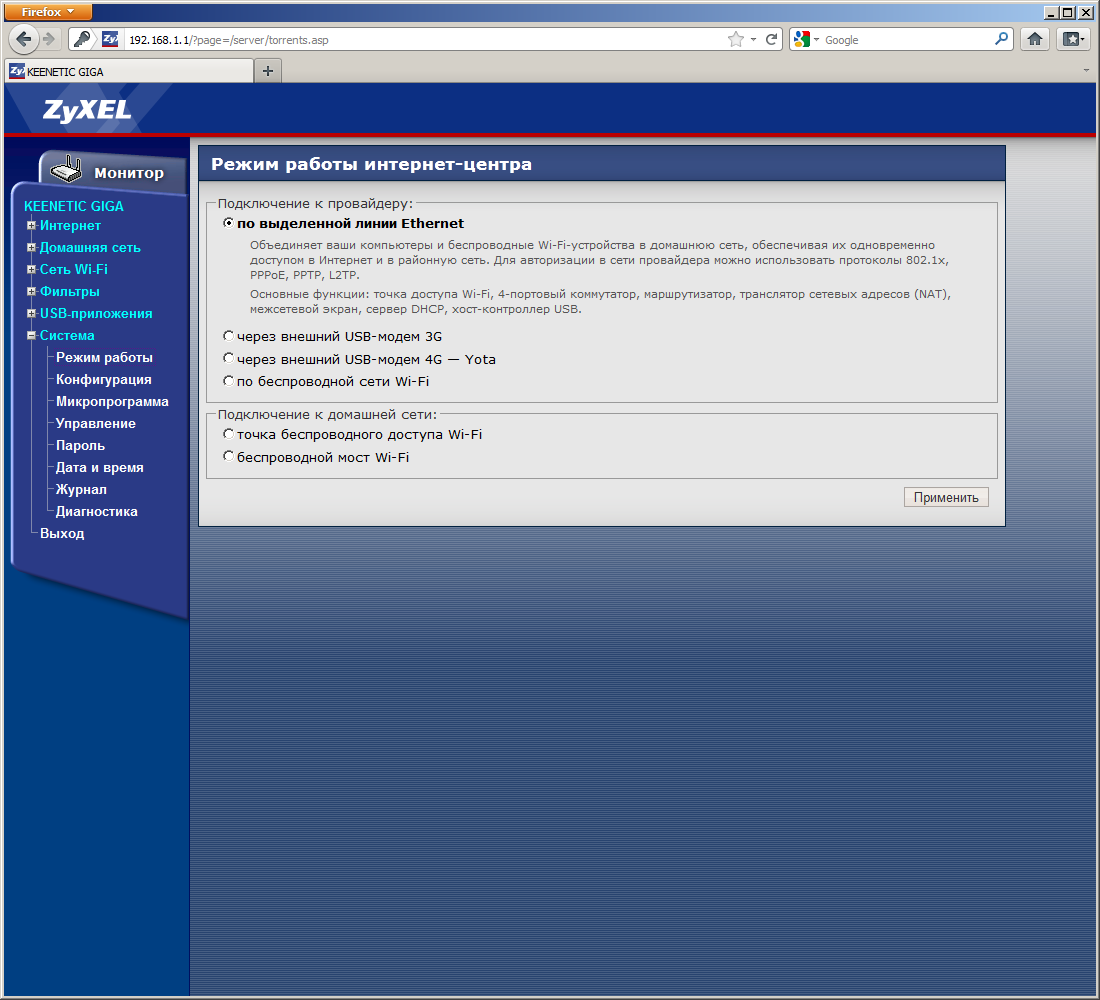 Последняя группа отдана на системные настройки. Здесь присутствуют привычные пункты по обновлению прошивки, работе с конфигурацией, изменению пароля администратора. Интернет-центром можно управлять и со стороны WAN-сегмента. Для этого нужно включить режим управления, выбрать порты (для HTTP и telnet), установить фильтр IP-адресов удаленных систем. Одним из наиболее важных является «Режим работы». Keenetic Giga умеет быть обычным Ethernet-роутером, осуществлять подключение к интернету через сотовый модем или Wi-Fi (в последнем случае его собственная точка доступа не сможет обслуживать клиентов), а также выступать в роли беспроводного моста или точки доступа.