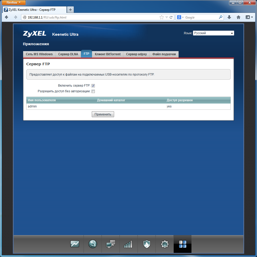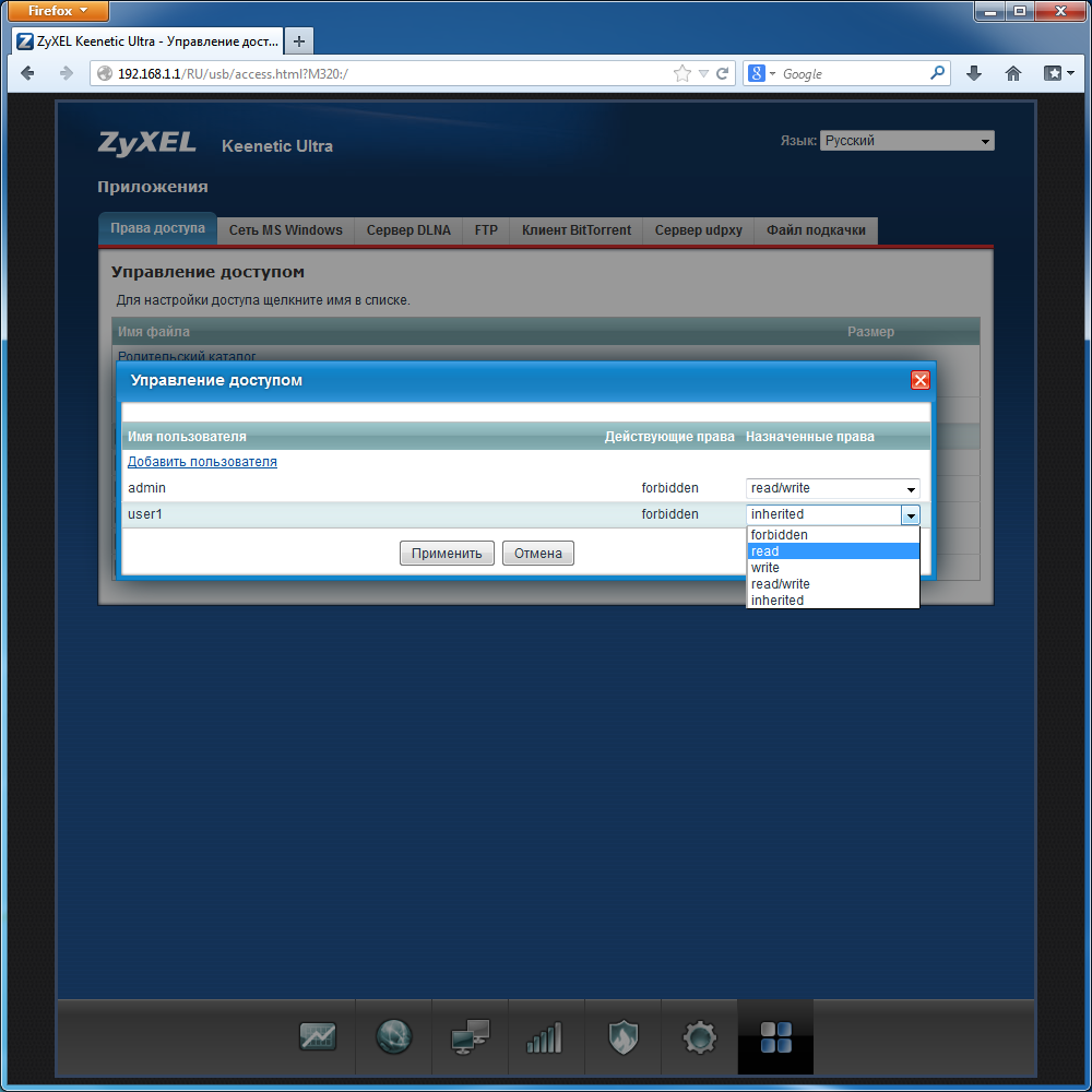 Для сервера FTP есть общий выключатель сервиса, разрешение анонимного доступа и выбор домашнего каталога для каждого пользователя. Номер порта изменить нельзя, ограничения скорости тоже нет. Отметим, что можно предоставить доступ к серверу и со стороны интерфейса WAN. Поддерживается пассивный режим и работа с русскими именами файлов.В устройстве предусмотрено несколько вариантов контроля доступа к сетевым ресурсам. В самой простой конфигурации можно разрешить работу с серверами всем пользователям сети без ограничений. Второй вариант — требование авторизации пользователя по имени и паролю. В этом случае доступ на чтение и запись предоставляется только запрограммированным в роутере аккаунтам, а выбрать разрешенные протоколы можно в свойствах пользователя. Для FTP здесь дополнительно можно указать домашнюю директорию для пользователей, выше которой они не смогут подняться. Наиболее полный вариант реализуется при установке дополнительного модуля идентификации пользователей. В этом режиме можно гибко устанавливать права каждому пользователю на каждую директорию, включая режимы «нет доступа», «только чтение» и «чтение и запись».