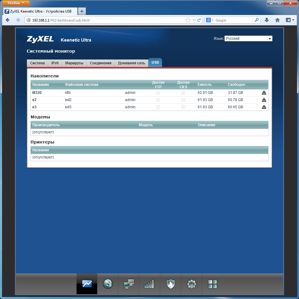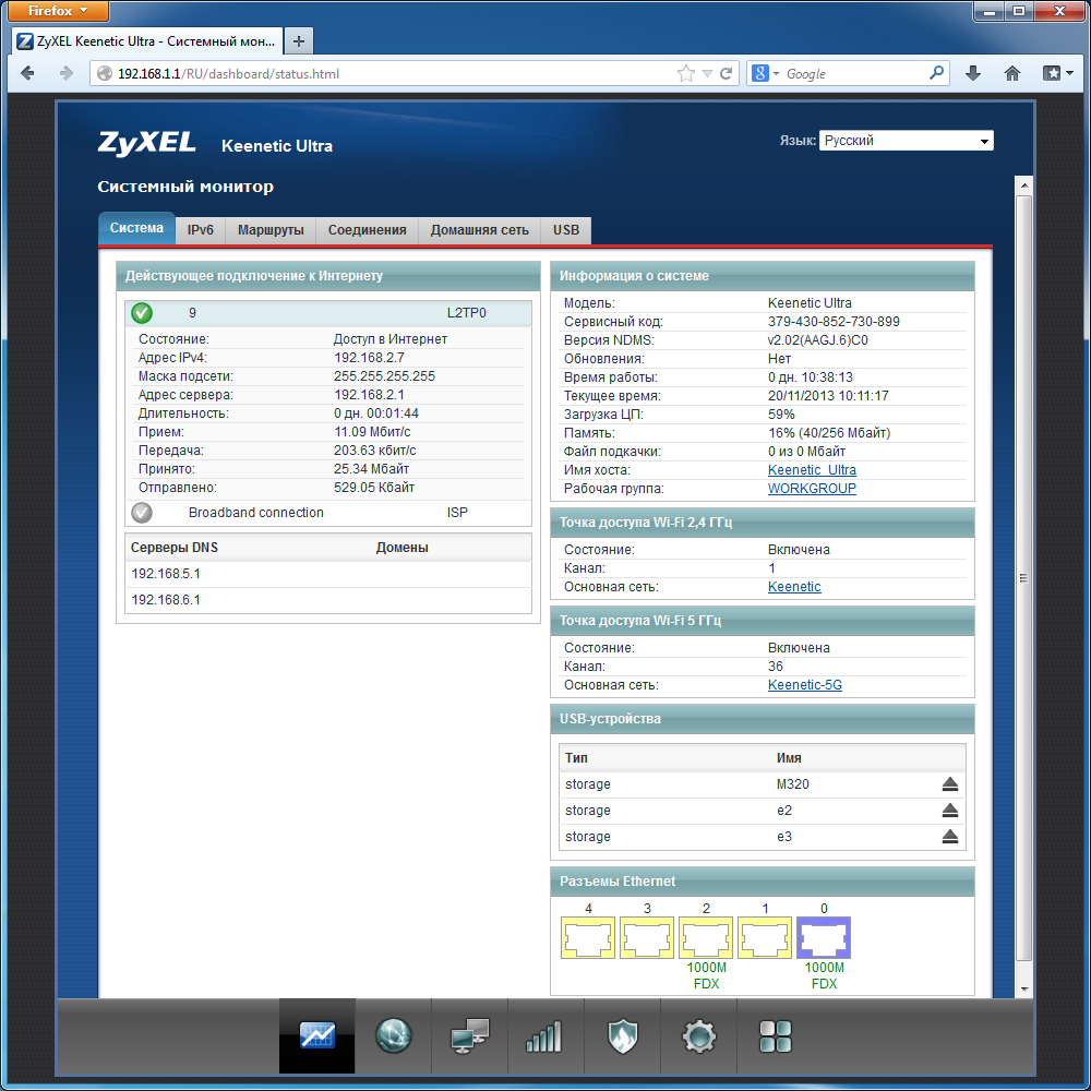В «Системный монитор» можно узнать всю информацию о текущем состоянии роутера. Кроме традиционной для Zyxel подробной страницы статуса, здесь предоставлены данные о IPv6, таблица маршрутизации, список текущих сессий, таблица клиентов локальной сети, информация о USB-устройствах.