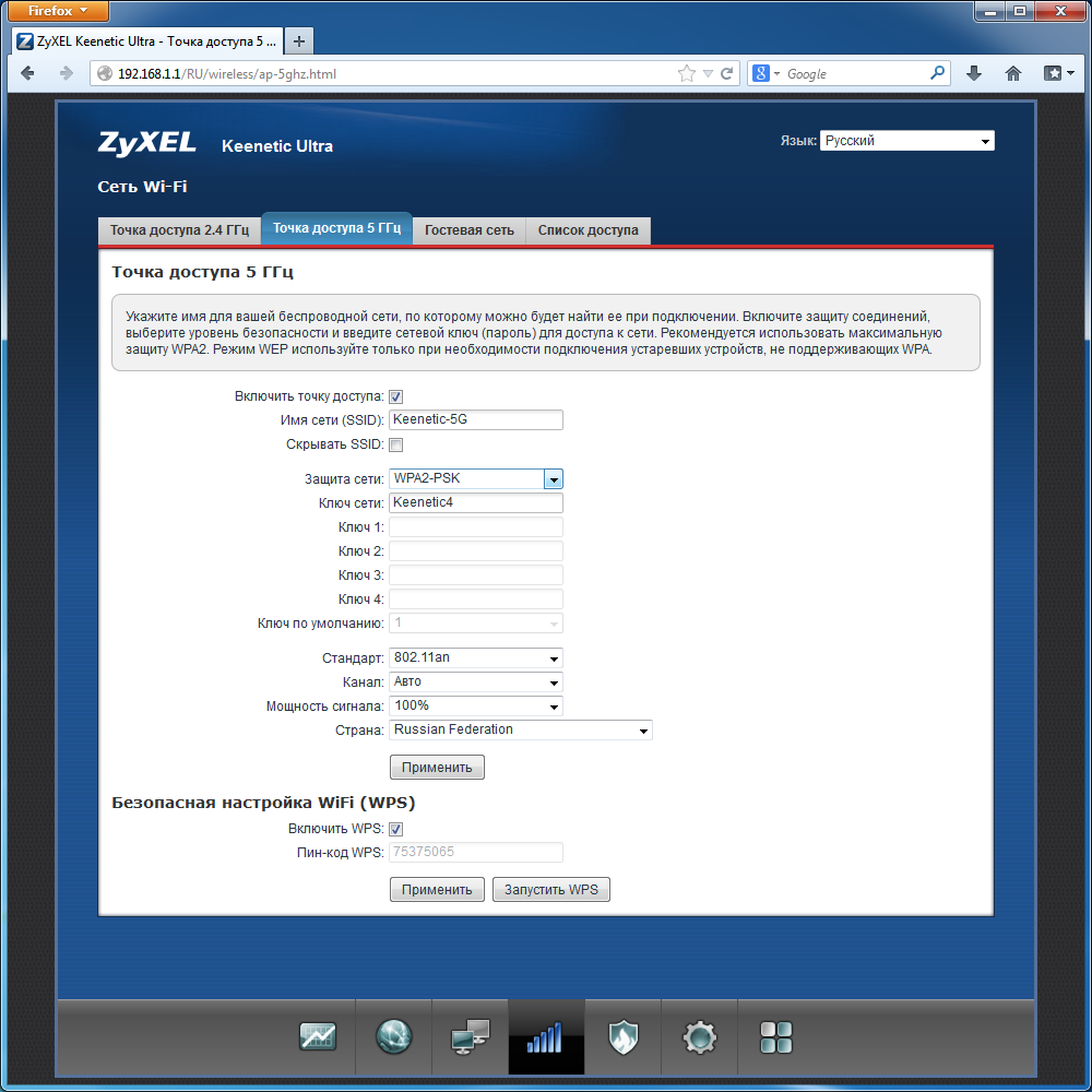 Раздел беспроводных сетей включает две страницы стандартных параметров для двух диапазонов: имя сети, режим защиты (открытая сеть, WEP, WPA/WPA2-PSK, регион, стандарт, канал, мощность сигнала, WPS. Нет только выбора ширины канала (используется установка «Авто», подходящая для подавляющего числа пользователей). Интернет-центр умеет также создавать и гостевую сеть в диапазоне 2,4 ГГц, для которой можно выбрать собственное имя, параметры безопасности и диапазон IP адресов. Клиенты этой сети могут общаться только друг с другом и выходить в интернет. Дополнительно присутствует фильтр доступа по MAC-адресам.