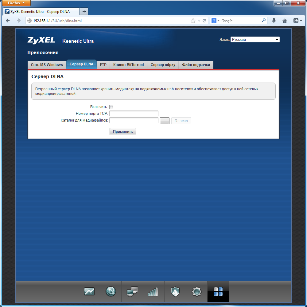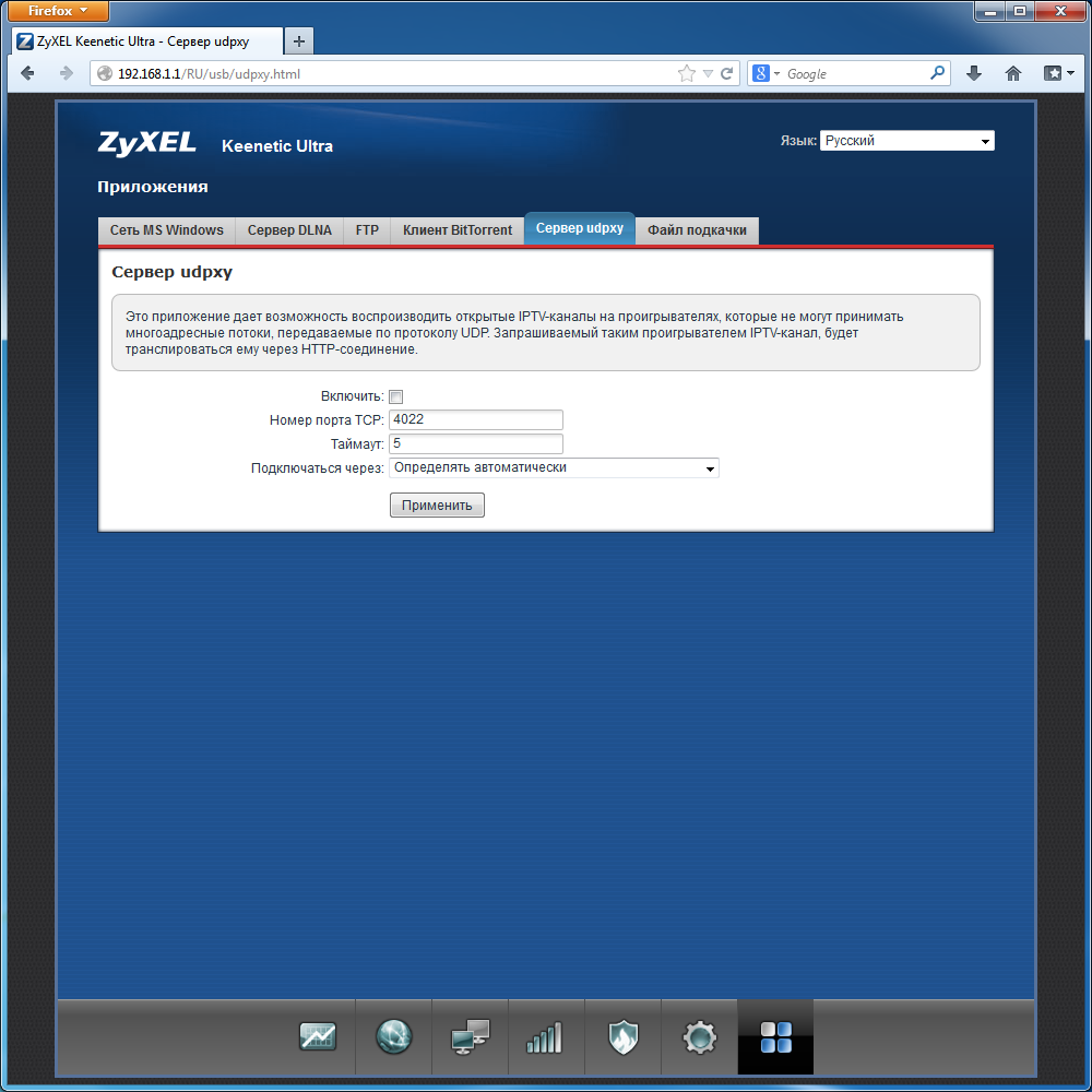 Последняя группа страниц интерфейса отвечает за работу с дополнительными приложениями интернет-центра. Поскольку большинство из них связано с использованием USB-периферии, мы расскажем о них в следующем разделе. Здесь же упомянем только наличие встроенного сервиса udpxy, который способен преобразовывать мультикаст-трансляции в юникаст, что заметно уменьшает нагрузку на сеть (особенно беспроводную) при использовании IPTV.