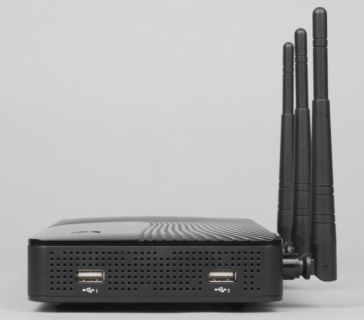 Индикаторы работы собраны на переднем торце. Здесь разместились следующие светодиоды: питание/статус, активность проводных портов, состояние беспроводных точек доступа, интернет, статус портов USB. В логотипах разобраться легко, яркость у индикаторов средняя, цвет — зеленый. Во время активности интерфейсов они мигают. Возможности определить скорость проводного подключения (100 или 1000 Мбит/с) индикаторам не предусмотрено, но при необходимости можно узнать эту информацию через веб-интерфейс. Опирается корпус на две резиновые и две пластиковые ножки. Последние по совместительству используются и для крепления роутера на стену. Вариант ориентации только один — антеннами вниз.
