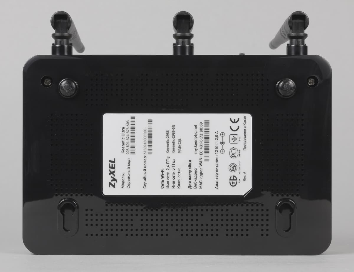 Сзади находятся все остальные разъемы и органы управления: гигабитный WAN, четыре гигабитных LAN, скрытая кнопка сброса, кнопка FN (используется для безопасного отключения USB-накопителей), вход блока питания и выключатель. Странно, что антенны сделали в этот раз несъемными. Конечно, в реальности мало кто пользуется возможностью установки и подключения альтернативных моделей антенн, но все-таки подобное решение характерно для бюджетных устройств, к которым Keenetic Ultra отнести сложно не столько по стоимости, сколько по возможностям и функциям. Кстати, производитель в этот раз использует не «съемные всенаправленные антенны 5 дБи», а «внешние всенаправленные антенны Wi-Fi (3 дБи)». Отметим, что у других представителей второго поколения, в частности Keenetic Giga II, используется именно первый вариант. Скорее всего, подобное решение было связано с поддержкой двух диапазонов работы, подобрать хорошие сменные варианты для которых не удалось.