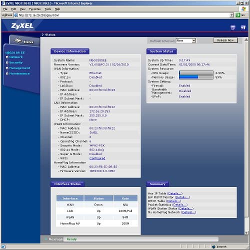 Первая страница, которую видит пользователь после входа, позволяет быстро оценить состояние устройства. На ней приводится вся существенная для диагностики работы информация — версия прошивки, IP- и MAC-адреса портов WAN и LAN, статус беспроводного и HomePlug AV подключений, текущая загрузка процессора и оперативной памяти. Здесь же есть несколько ссылок на справочные таблицы с указанием клиентов DHCP и сетей Wi-Fi и HomePlug. На наш взгляд, любое домашнее устройство должно иметь подобную возможность отображения важных для функционирования параметров на одной странице. Это существенно упрощает решение возможных проблем с подключением.
