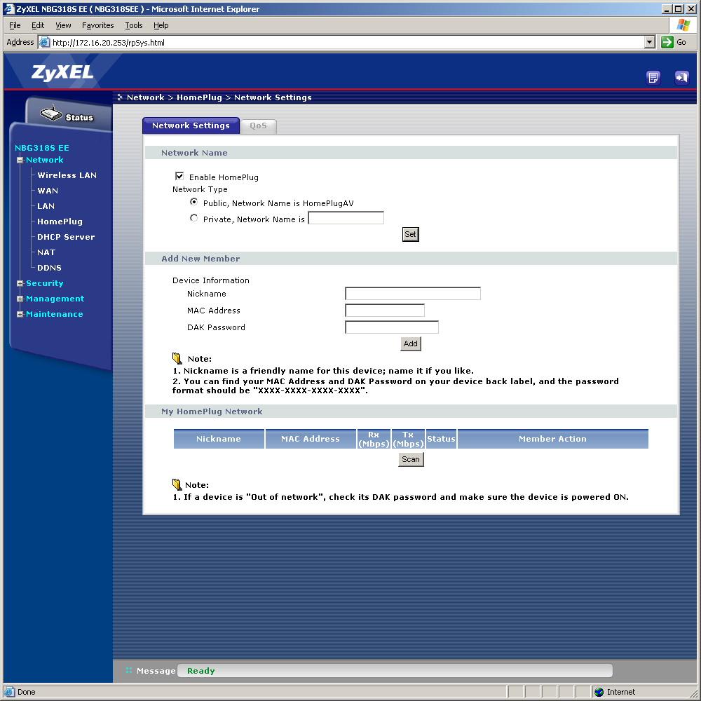 Второй моделью из новой линейки интернет-центров компании ZyXEL, попавшей в нашу лабораторию, стал NBG318S. Отличительной его особенностью является встроенный адаптер сети HomePlug AV, который используется для подключения устройств по проводам электропитания. Это решение позволяет провести высокоскоростную сеть в точки, в которых не было предусмотрено компьютерной проводки. Например, для IPTV-приставки около телевизора. Единственное, что надо учесть при использовании данного типа подключения, это зависимость от протяженности линии, необходимость установки устройств на одну линию фазы и невозможность использования сетевых фильтров и ИБП.