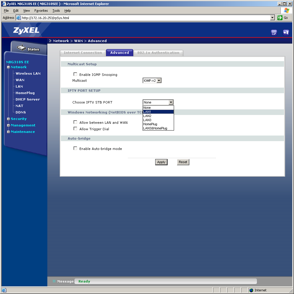 Еще одна настройка режима работы находится в группе «Maintenance». Она позволяет выбрать одну из схем функционирования: роутер с Ethernet-портом WAN, роутер с HomePlug подключением к Интернет или просто беспроводная точка доступа.