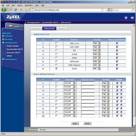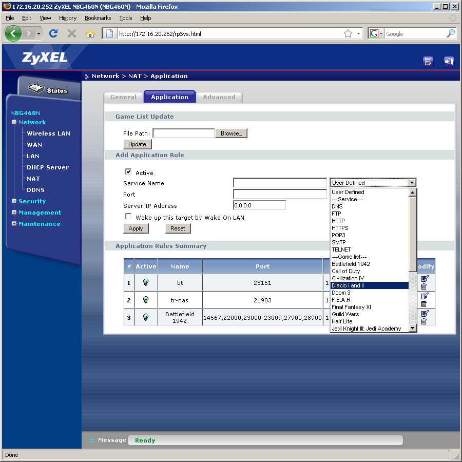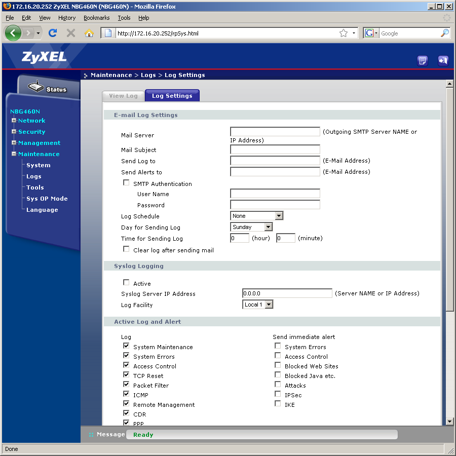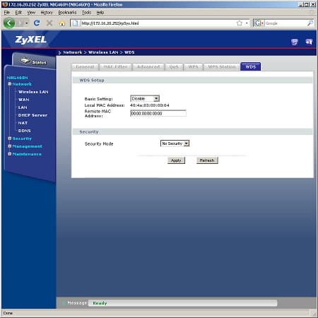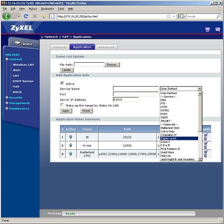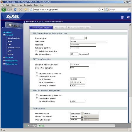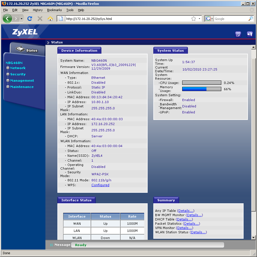 Устройство тестировалось с прошивкой версии V3.60(BFL.0)b3_20091229. На момент написания статьи еще не была окончательно сконфигурирована для NBG460N утилита для быстрой настройки устройств NetFreind, так что нам пришлось воспользоваться браузером.