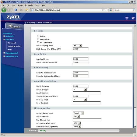 Поскольку NBG460N построен на весьма производительной аппаратной платформе, то компания реализовала также возможность работы с VPN-туннелями для безопасного соединения локальных сетей через Интернет. В данном случае можно установить одновременно до двух соединений с поддержкой многих опций IPSec. Опция актуальна скорее для бизнес-применений, так как домашним пользователям было бы более интересно организовать безопасный доступ в домашнюю сеть через Интернет с использованием стандартного клиента Windows.