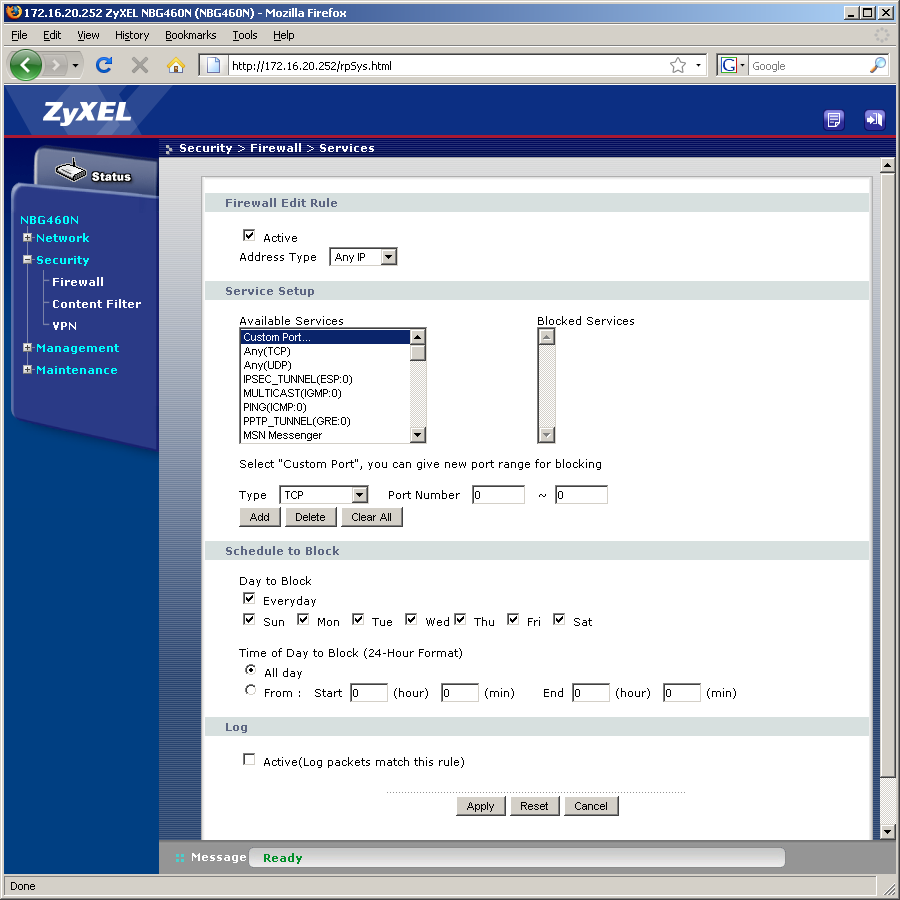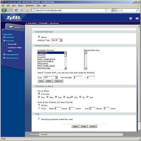 Возможности указать направление для фильтра в этой модели нет. Пользователю предлагается выбор следующих параметров для установки правил: адрес отправителя (можно сделать и список и диапазон), список портов получателя, дни и время работы. Несколько странно смотрится только адрес отправителя, интереснее было бы иметь также и поле для выбора адреса получателя. Кроме этого явно не хватает опции по явному разрешению доступа, а также пункта по выбору действия по умолчанию. Так что в текущем варианте правила скорее будут идти в виде «запретить указанному клиенту что-то делать в сети», чем «блокировать доступ к определенному ресурсу». Впрочем, обычно и этого вполне достаточно, учитывая, что на любом компьютере, который работает с Интернет, сегодня обязаны быть установлены и антивирус и межсетевой экран. Не очень понравилось в данной реализации и то, что если хочется просматривать логи по срабатыванию защиты, в список будут также добавляться и все NAT-сессии, которых бывает очень много, поскольку отдельной категории именно для Firewall нет, а список событий, доступный из web-интерфейса ограничен 128-ю последними записями.