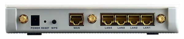 На задней панели заметны существенные изменения — в этот раз здесь расположены целых три коннектора для антенн, разъем питания, кнопка сброса, кнопка WPS, порт WAN и четыре порта LAN.
