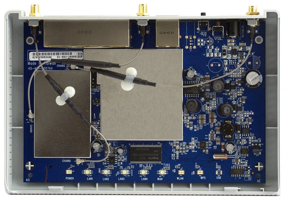 Как уже стало понятно по спецификациям — начинка интернет-центра полностью изменилась. Основной процессор устройства — специализированный чип Atheros AR9132, работающий на частоте 400 МГц. Для работы он использует 32 МБ оперативной памяти и 8 МБ флеша. Для полноты картины к ним добавляется гигабитный коммутатор Realtek RTL8366 и радиоблок Atheros AR9103.