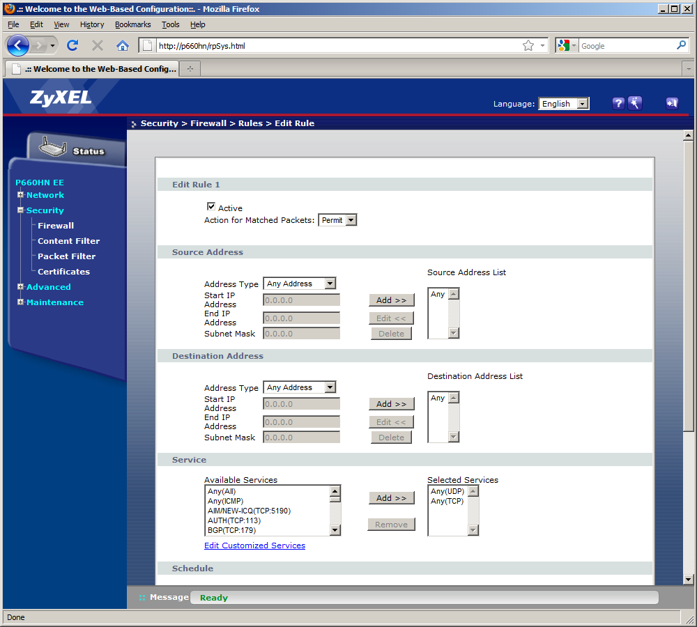 В группе «Security» пользователь может настроить встроенный межсетевой экран, фильтр контента, а также пакетный фильтр. Firewall работает на сегменте WAN-LAN, его правила могут включать в себя адреса источника и получателя, а также порты/сервисы. Для каждого правила можно указать расписание работы и действие (Permit, Drop, Reject).