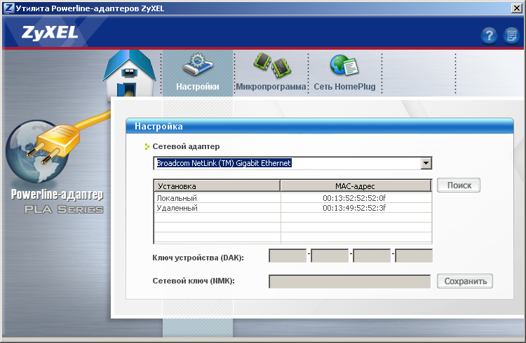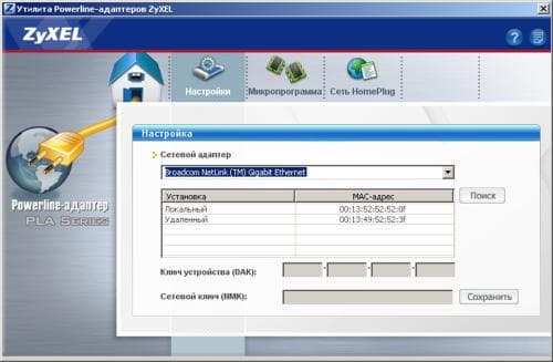 Однако с P660HWP все еще проще — можно не использовать программу, а настроить все прямо из NetFriend или Web-интерфейса интернет-центра. Для этого используется так называемый Device Access Key (DAK), который индивидуален для каждого адаптера и записан на его корпусе. Зная его, можно задать имя сети для каждого HomePlug AV адаптера в сети, даже если они не производства ZyXEL. Собственное программное обеспечение адаптеров, кроме установки имени сети, имеет дополнительные функции, такие как отображение уровня сигнала, диагностика адаптера, обновление его прошивки и так далее. Кстати, настраивать все адаптеры, планируемые для установки в сеть, можно в одной розетке и на одном ПК, а потом просто переставить их на необходимые места.