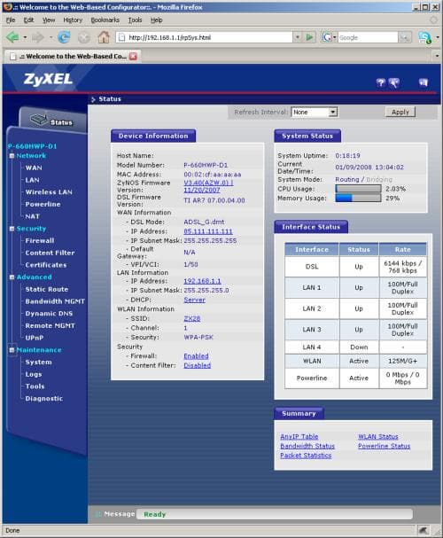 Стоит рассказать об особенностях реализации порта HomePlug AV в рассматриваемой модели интернет-центра. Один из вариантов использования этой технологии — подключение декодера IPTV (например, для работы со СТРИМ-ТВ). Использование электропроводки позволяет установить его в любом месте квартиры без необходимости прокладки сетевых кабелей. В текущей версии прошивки в этом режиме на HomePlug AV может быть только приставка IPTV и не может быть других устройств. Учитывая наличие в P660HWP и Wi-Fi, это не сильно ограничивает возможности. Если хочется использовать HomePlug AV для создания сети (например, подключить сетевой медиаплеер, для которого забыли проложить кабель), то декодер нужно будет подключить в один из LAN-портов интернет-центра. При необходимости, можно использовать сразу все интерфейсы для создания локальной сети (LAN, Wi-Fi и HomePlug AV) и подключения IPTV через электросеть, однако в этом случае настройка несколько сложнее, так как придется отключать встроенный DHCP-сервер и назначать адреса всем устройства вручную. По информации компании ZyXEL, в настоящее время ведутся работы над прошивкой, которая позволит максимально использовать возможности устройства и при этом сохранить легкость настройки и управления.