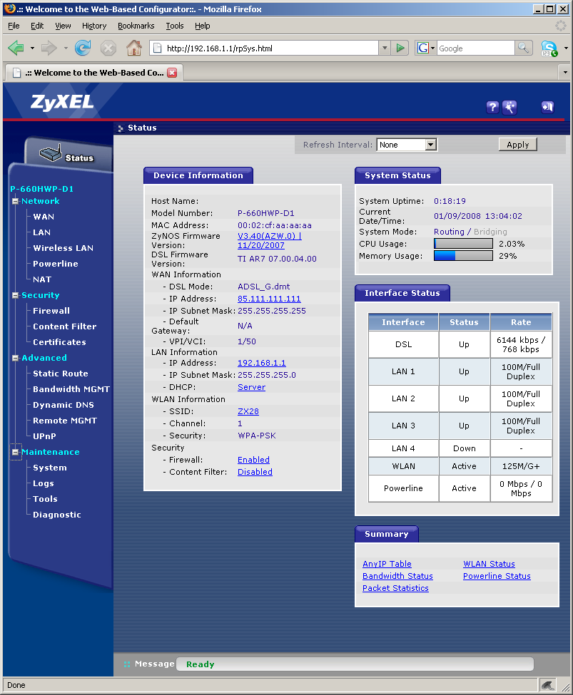 Сам Web-интерфейс уже многократно описывался нами, так что кратко пройдемся по нему и остановимся только на некоторых особенностях. Первая страница отображает полную информацию о текущем режиме работы устройства. Включая состояние всех портов, загрузки процессора и оперативной памяти. Здесь же присутствуют ссылки на разные полезные таблицы — DHCP-сервера, беспроводных клиентов, статистики сети.