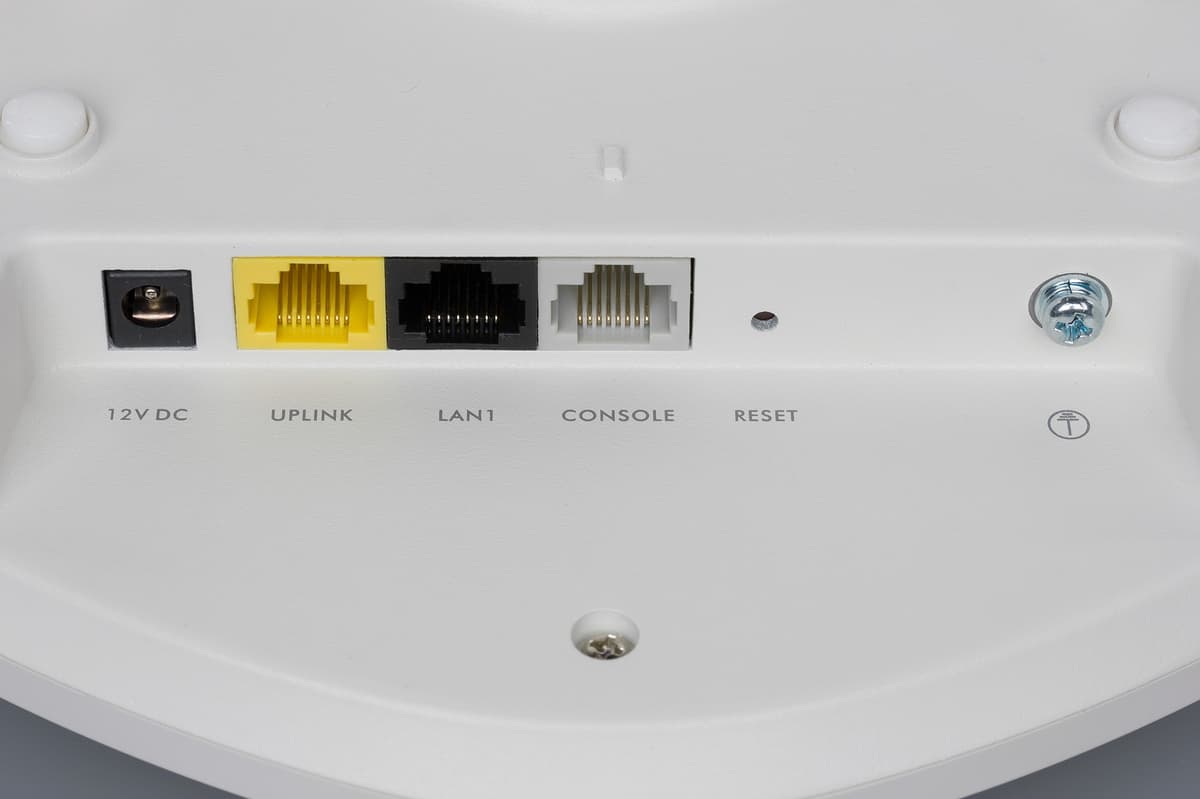 Разъемы для подключения кабелей и питания находятся в нише на нижней стороне корпуса. Здесь есть вход блока питания, два гигабитных сетевых порта (один — с поддержкой PoE), консольный порт, скрытая кнопка сброса и винт для заземления.